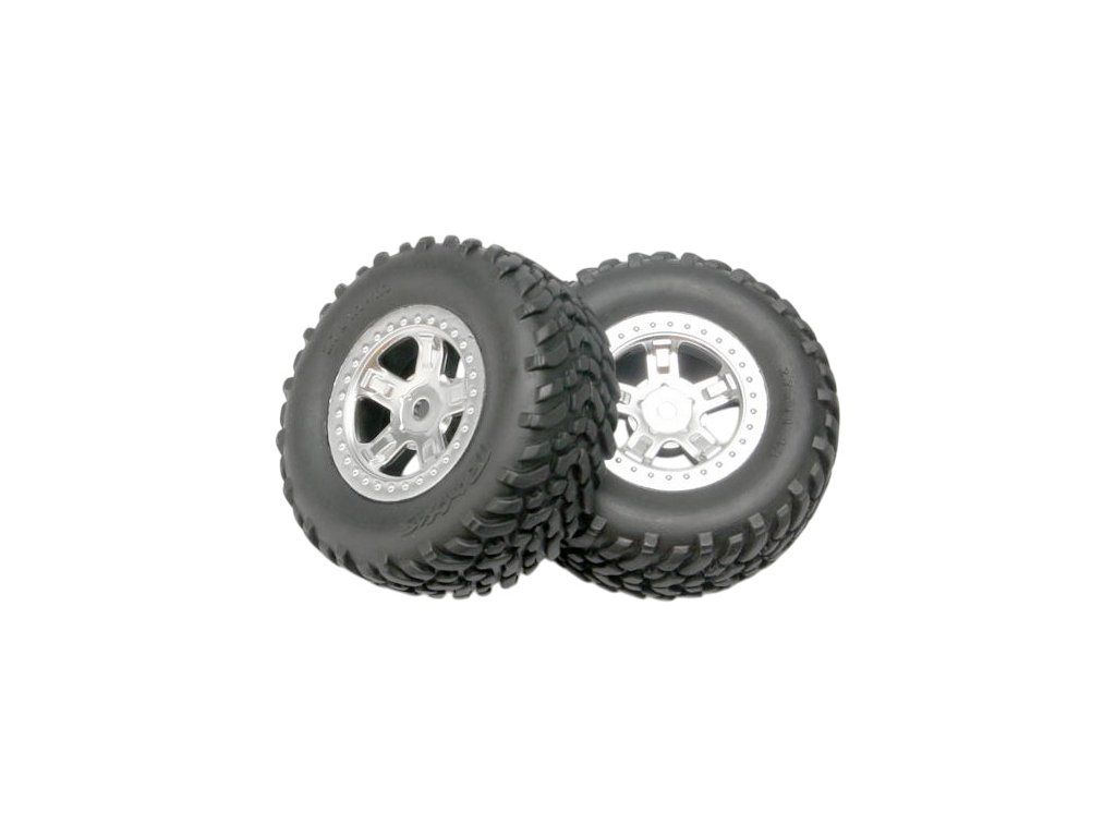 Kompletní univerzální kola pro RC auta Traxxas Slash 1:16. Stříbrný disk s nalepenými pneumatikami Off-Road a vložkou. Rozměr disku 38/50x27 mm. Celkový rozměr 66x29 mm. Unašeč je šestihran 12 mm s offsetem 24 mm.