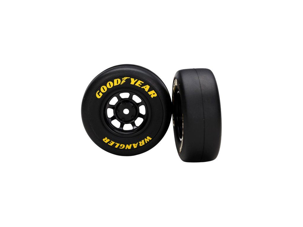 Kompletní univerzální kola pro auta Traxxas Rally 1:16. Osmi paprskový černý disk s nalepenými pneumatikami Goodyear Wrangler. Rozměr disku 53x26 mm. Celkový rozměr 65x26 mm. Unašeč je šestihran 12 mm s offsetem 17 mm.