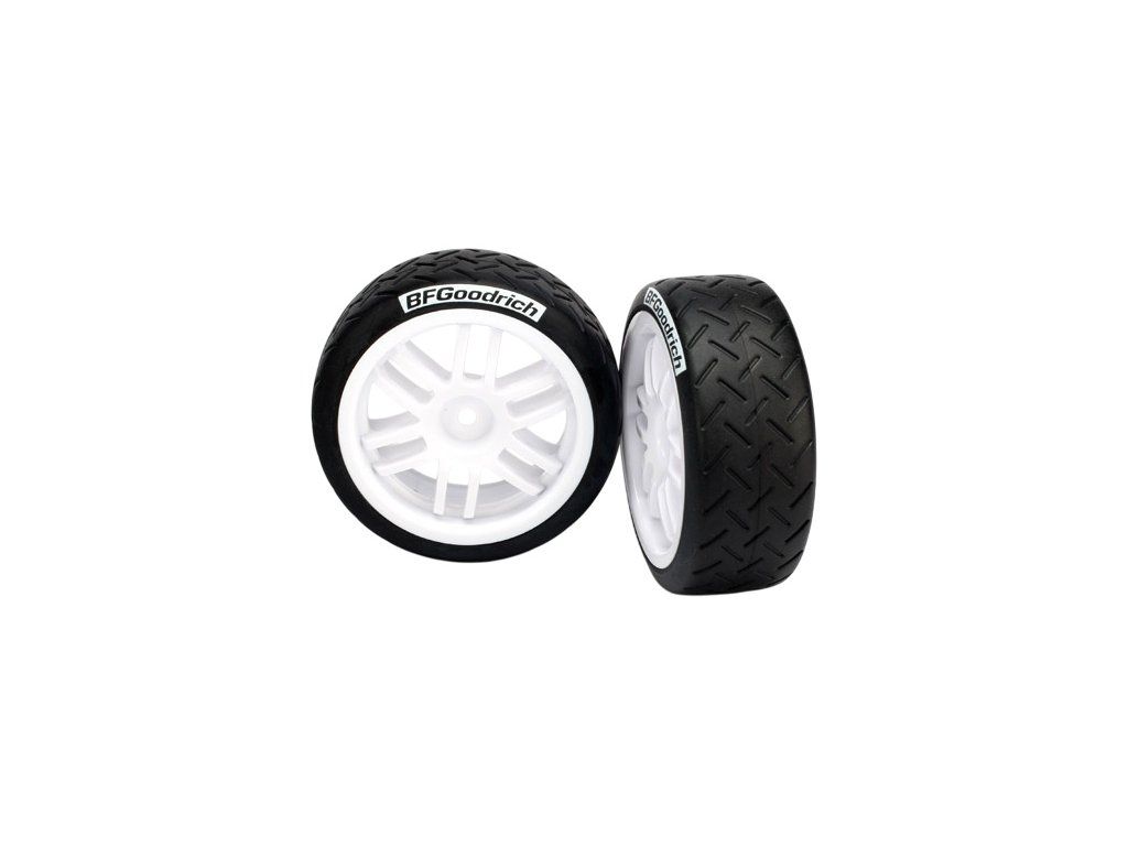 Kompletní univerzální kola pro RC auta Traxxas Rally 1:16. Bílý disk s nalepenými pneumatikami BFGoodrich® Rally. Rozměr disku 53x26 mm. Celkový rozměr 65x26 mm. Unašeč je šestihran 12 mm s offsetem 17 mm.