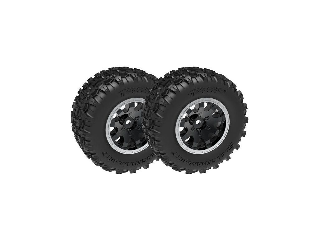 Kompletní zadní kola pro RC auto Traxxas Mini Maxx. Disk černý saténový s pneumatikami Sledgehammer s pěnovou vložkou. Průměr disku 2.1" (vnější) /2.6" (vnitřní).