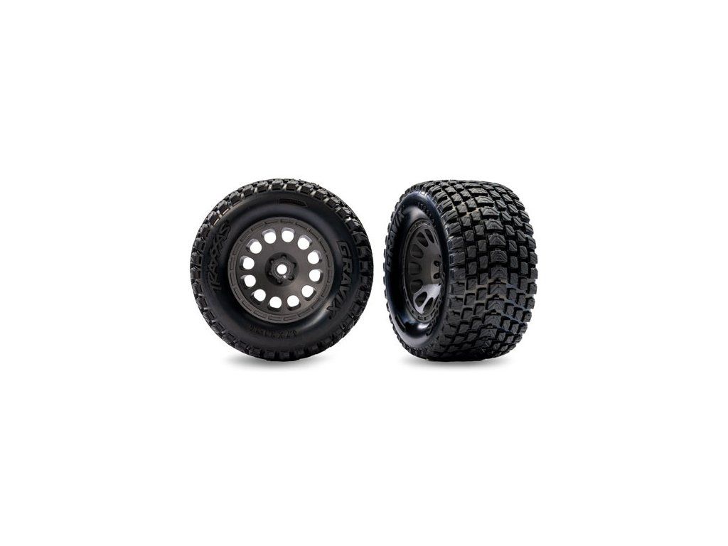 Kompletní přední kola pro RC auto Traxxas Mini XRT. Disk uhlově šedý s pneumatikami Gravix s pěnovou vložkou. Průměr disku 2.1" (vnější) /2.6" (vnitřní).