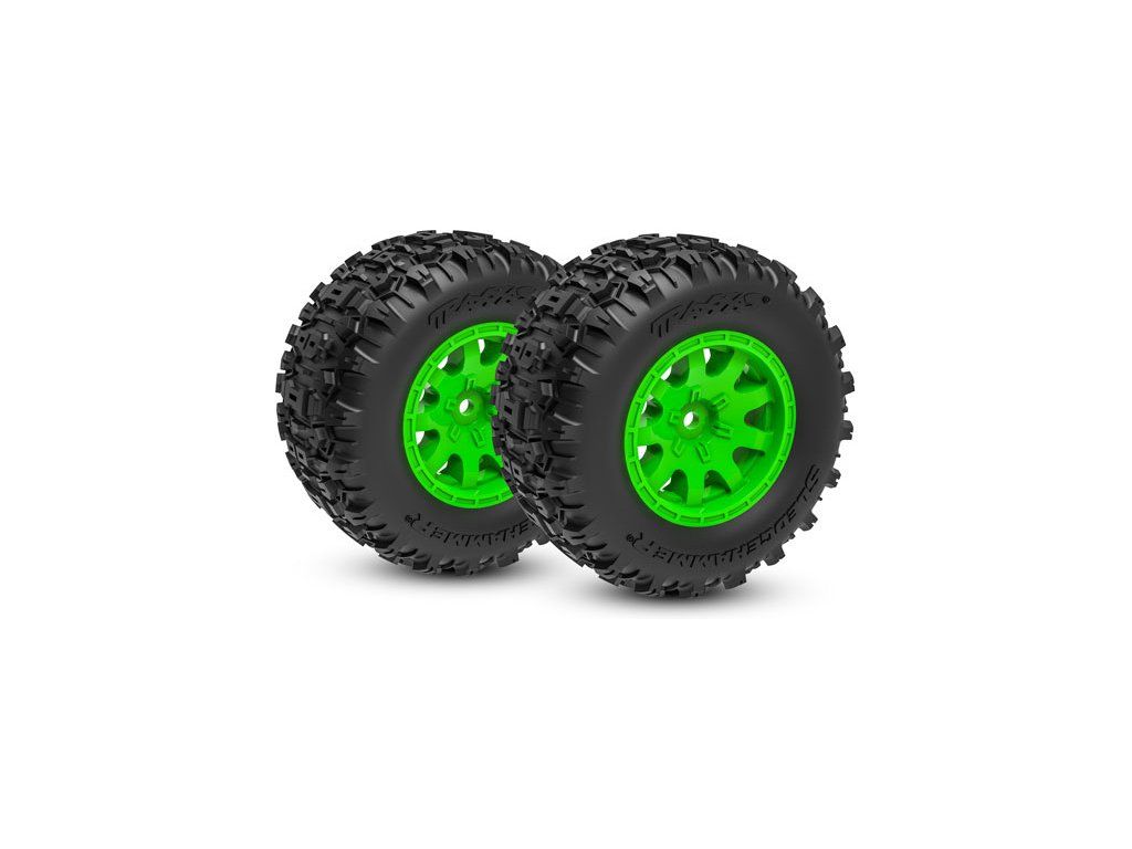 Kompletní přední kola pro RC auto Traxxas Mini Maxx. Disk zelený s pneumatikami Sledgehammer s pěnovou vložkou. Průměr disku 2.1" (vnější) /2.6" (vnitřní).