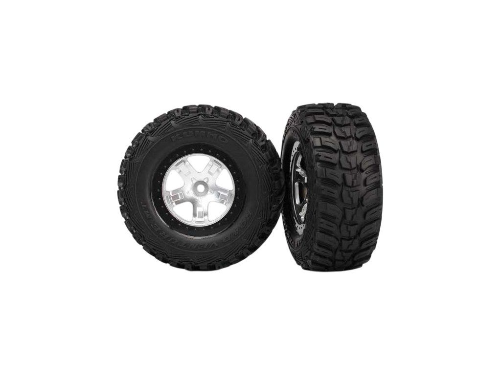 Kompletní zadní kola pro 2WD, přední i zadní pro 4WD auta Traxxas Slash. Stříbrné disky s černými ráfky a nalepenými pneumatikami Kumho a vložkou (měkká směs). Rozměr disku 61/81x42 mm. Celkový rozměr 110x46 mm. Unašeč je šestihran 12mm s offsetem 24 mm.