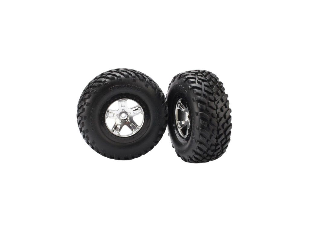 Kompletní zadní kola pro 2WD, přední i zadní pro 4WD auta Traxxas Slash. Stříbrné disky s černými ráfky a nalepenými pneumatikami Off-Road s vložkou. Rozměr disku 61/81x42 mm. Celkový rozměr 110x46 mm. Unašeč je šestihran 12mm s offsetem 24 mm.