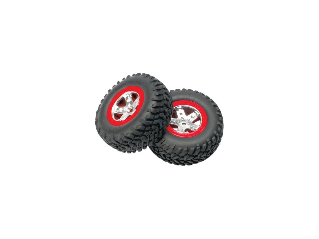 Kompletní zadní kola pro 2WD, přední i zadní pro 4WD auta Traxxas Slash. Chromované disky s červenými ráfky a nalepenými pneumatikami BFGoodrich® s vložkou. Rozměr disku 61/81x42 mm. Celkový rozměr 110x46 mm. Unašeč je šestihran 12mm s offsetem 24 mm.