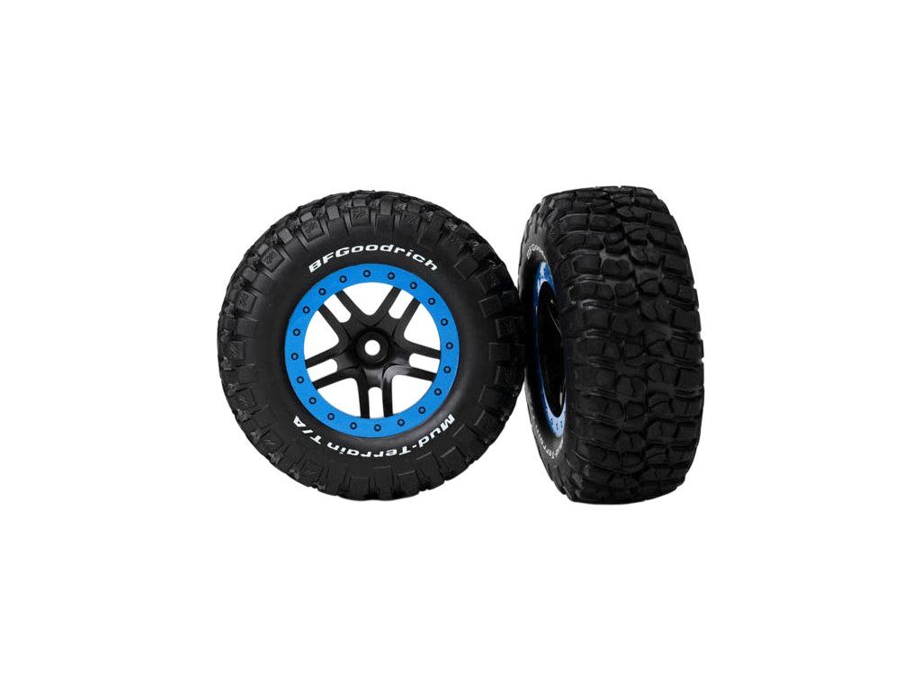 Kompletní zadní kola pro 2WD, přední i zadní kola pro 4WD RC auta Traxxas Slash. Disky Split Spoke černé se modrými ráfky, nalepené pneumatiky Goodrich KM2 Mud Terrain. Rozměr disku 61/81x42 mm. Celkový rozměr 110x46 mm. Unašeč je šestihran 12mm s offsetem 24 mm.