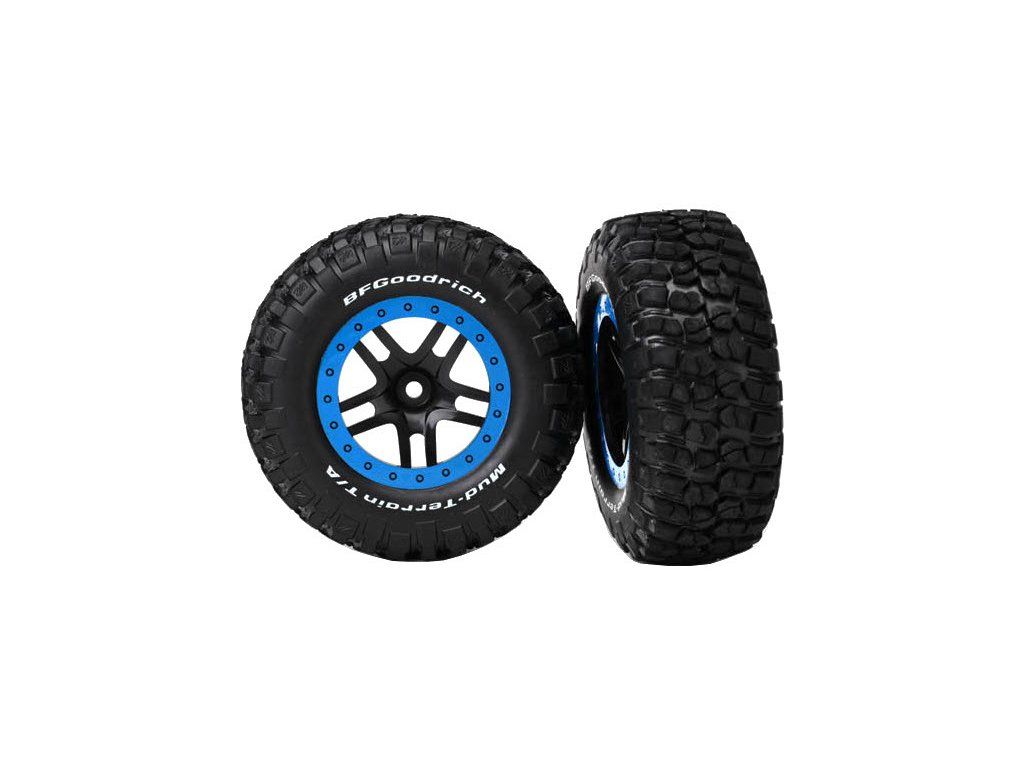 Kompletní přední kola pro 2WD RC auta Traxxas. Disky Split Spoke černé se modrými ráfky, nalepené pneumatiky Goodrich KM2 Mud Terrain. Rozměr disku 61/81x42 mm. Celkový rozměr 110x46 mm. Unašeč je šestihran 12mm s offsetem 22 mm.