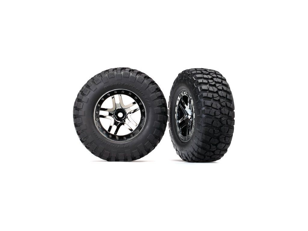 Kompletní zadní kola pro 2WD, přední i zadní pro 4WD RC auta Traxxas. Stříbrný disk Split-Spoke s pneumatikami BFGoodrich KM2 Mud Terrain (S1 super měkká směs) s vložkou. Rozměr disku 61/81x42 mm. Celkový rozměr 110x46 mm. Unašeč je šestihran 12mm s offsetem 24 mm.