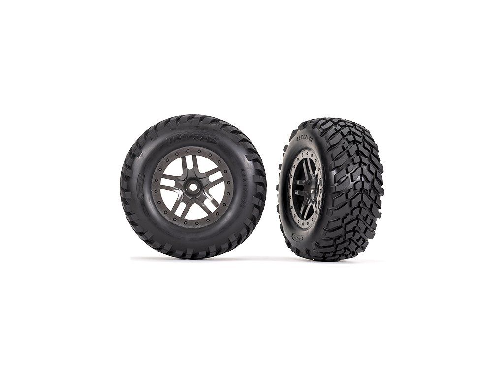 Kompletní zadní kola pro 2WD, přední i zadní pro 4WD auta Traxxas Slash. Šedé disky SCT Split-Spoke s nalepenými pneumatikami SCT s vložkou. Rozměr disku ø56/76x42 mm. Celkový rozměr ø110x46 mm. Unašeč je šestihran 12 mm s offsetem 24 mm.