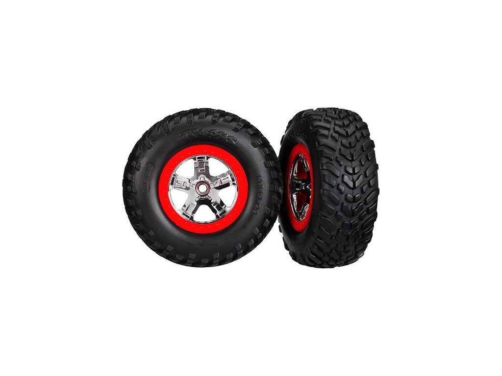 Kompletní zadní kola pro 2WD, přední i zadní pro 4WD auta Traxxas Slash. Chromované disky SCT s červenými ráfky s nalepenými pneumatikami SCT a vložkou. Rozměr disku 61/81x42 mm. Celkový rozměr 110x46 mm. Unašeč je šestihran 12 mm s offsetem 24 mm.
