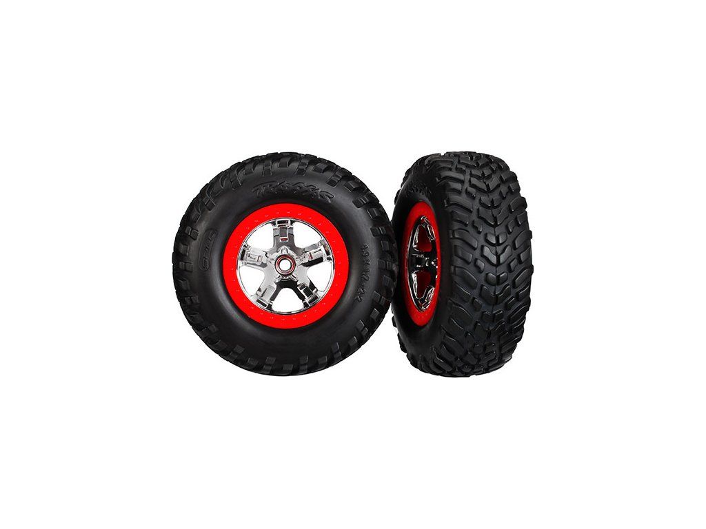 Kompletní přední kola pro 2WD RC auta Traxxas. Disky SCT chromováné s červenými ráfky a nalepené pneumatiky SCT. Rozměr disku 61/81x42 mm. Celkový rozměr 110x46 mm. Unašeč je šestihran 12mm s offsetem 22 mm.
