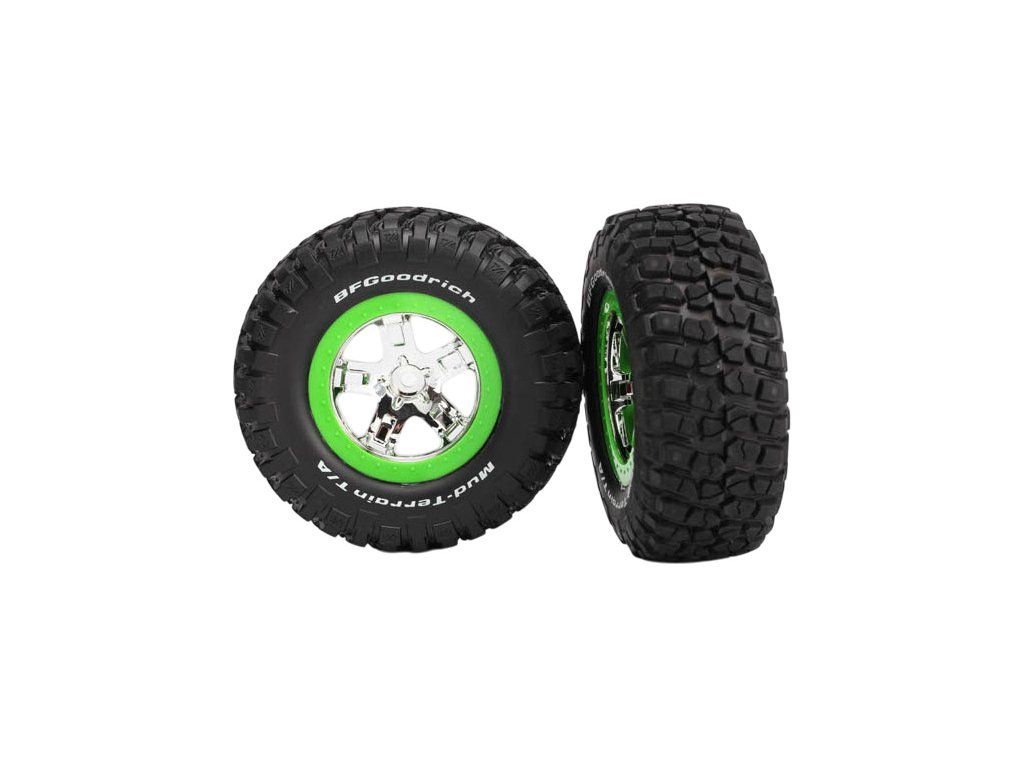 Kompletní přední kola pro RC auta. Chromované disky se zelenými ráfky a nalepenými pneumatikami BFGoodrich® s vložkou. Rozměr disku 61/81x42 mm. Celkový průměr 110x46 mm. Unašeč je šestihran 12 mm s offsetem 22 mm