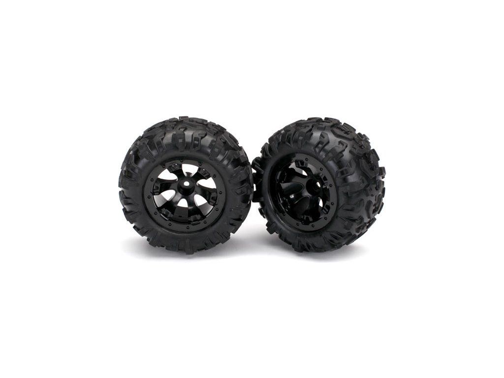 Kompletní univerzální kola pro RC auta. Černý disk Geode s nalepenými pneumatikami Canyon AT s vložkou. Rozměr disku 60x42 mm. Celkový rozměr 102x54 mm. Unašeč je šestihran 12 mm s offsetem 18 mm.
