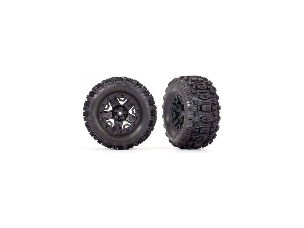 Traxxas kolo 2.8", disk černý, nalepené pneu Sledgehammer s pěnovou vložkou - (zadní) (2ks). Pro modely auta 1:10. Unašeč 12 mm, průměr kola 132mm, šířka 72mm.