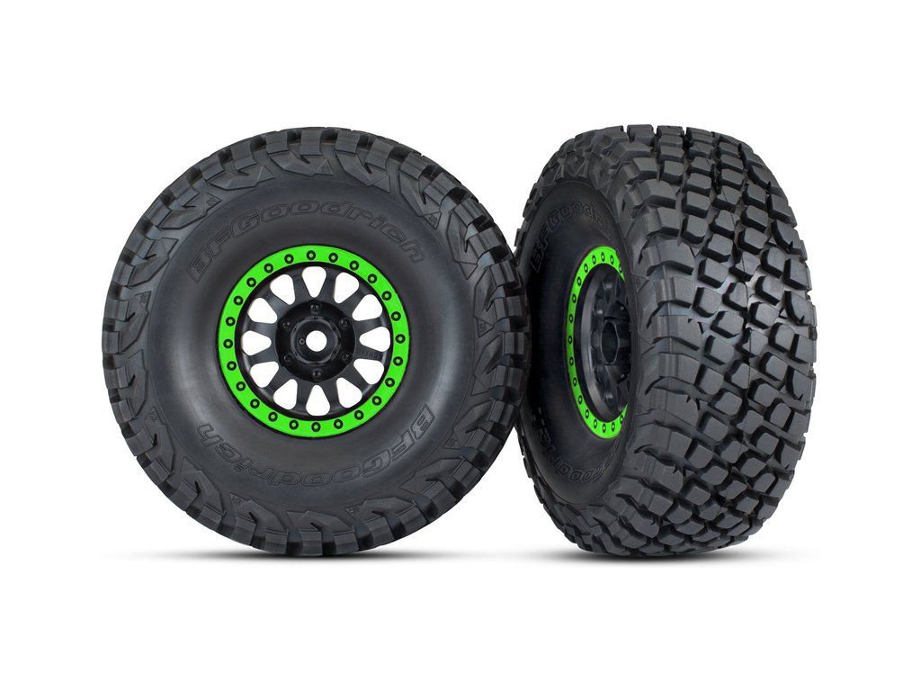 Kompletní univerzální kola pro Traxxas Unlimited Desert Racer. Disky Method Racing v černém provedení se zelenými ráfky a pneumatikami Baja KR3 (2 ks v balení). Rozměr disku 60/82x40 mm. Celkový rozměr 135x56 mm. Unašeč je šestihran 17 mm s drážkami a offsetem 25 mm.