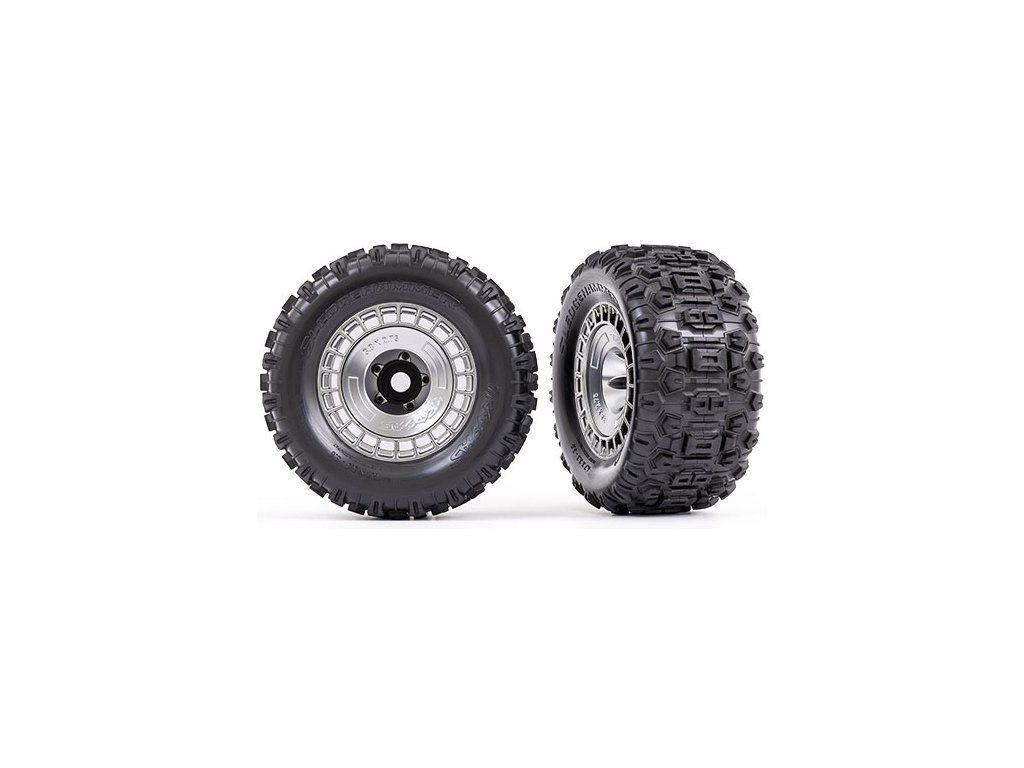 Traxxas kolo 3.8", pneu Sledgehammer, disk polomatně chromovaný s výměnnou poklicí. 2 ks. Pneumatiky, díky inspiraci motokrosem, poskytují extrémní trakci a kontrolu nad modelem. Možnost různého offsetu s volitelnou sadou #9567. Unašeč 17 mm šestihran - drážkovaný.