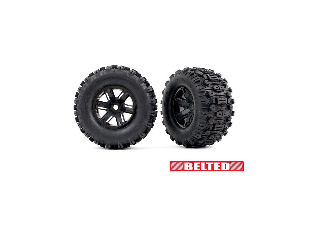 Náhradní díl pro RC modely aut Traxxas X-Maxx, X-Maxx® Ultimate a XRT: kolo 4.3/5.7", disk X-Maxx černý, pneu Sledgehammer (pár). Pneumatiky jsou vybaveny lehkým pásem v kostře, který zabraňuje vyboulení při vysokých rychlostech.