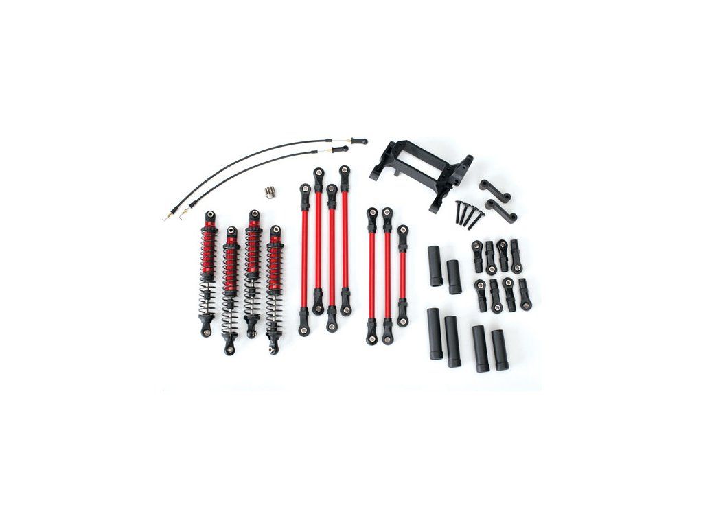 Tuningová konverzní sada v červené barvě pro podvozek Traxxas TRX-4 umožňující vyšší zdvih kol. Sada obsahuje veškeré potřebné díly potřebné k přestavbě.