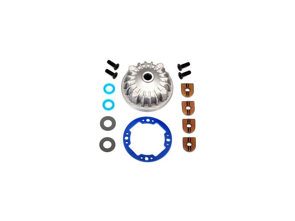 Náhradní díl pro centrální diferenciály používané v modelech Traxxas v měřítku 1:10 a 1:12: krabička diferenciálu. Obsahuje hliníkovou krabičkou, těsnění, X-kroužek (2), podložky 5x10x0,05 mm (2) a šrouby 2,5x8 mm (4).