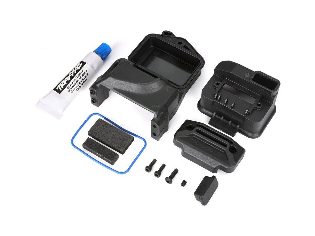 Náhradní díl pro RC modely aut Traxxas XO-1: krabička přijímače s držákem serva - voděodolná, pěnová průchodka kabelů, záslepka pro párování, montážní příslušenství, silikonové mazivo.