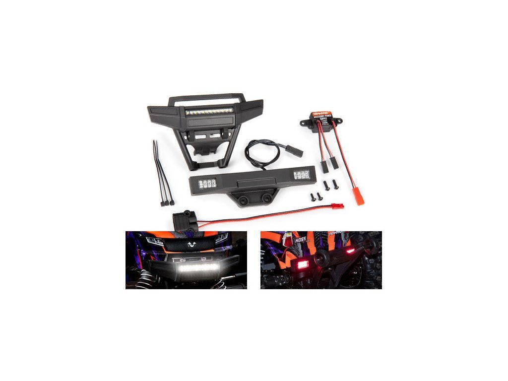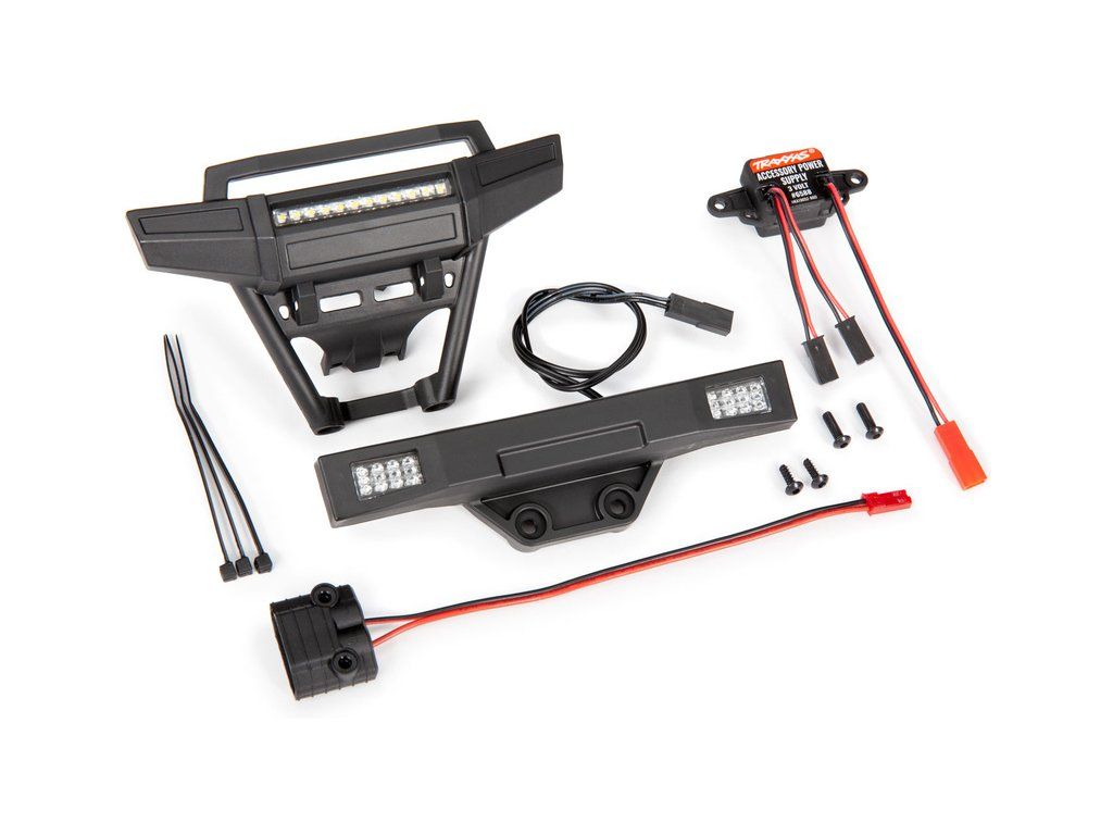Balení obsahuje: Přední nárazník s LED - TRA9096, zadní nárazník s LED - TRA9097, napájecí zdroj 3V / 3A TRA6588, montážní příslušenství.