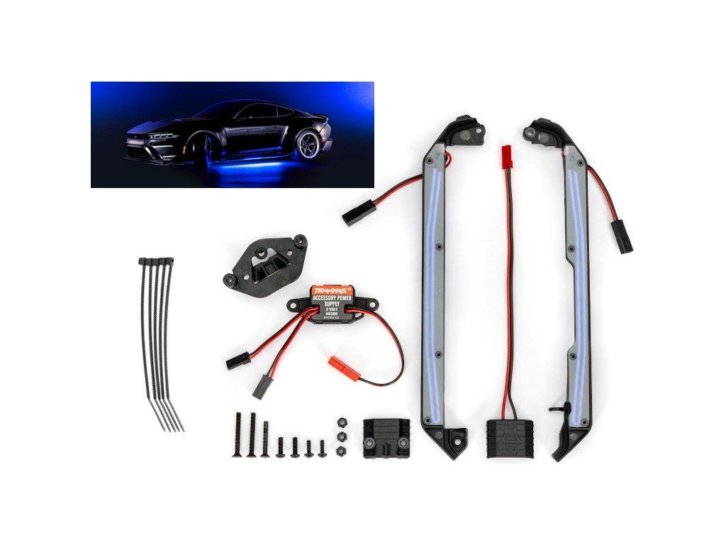 Traxxas LED podsvícení šasi modré dodá nezapomenutelný styl vašemu RC modelu Drift nebo jiným modelům s podvozek 4-Tec 2.0. Kompletní sada dvou prahových lišt s podsvícením, včetně napájecího zdroje, adaptéru konektoru a montážního příslušenství.