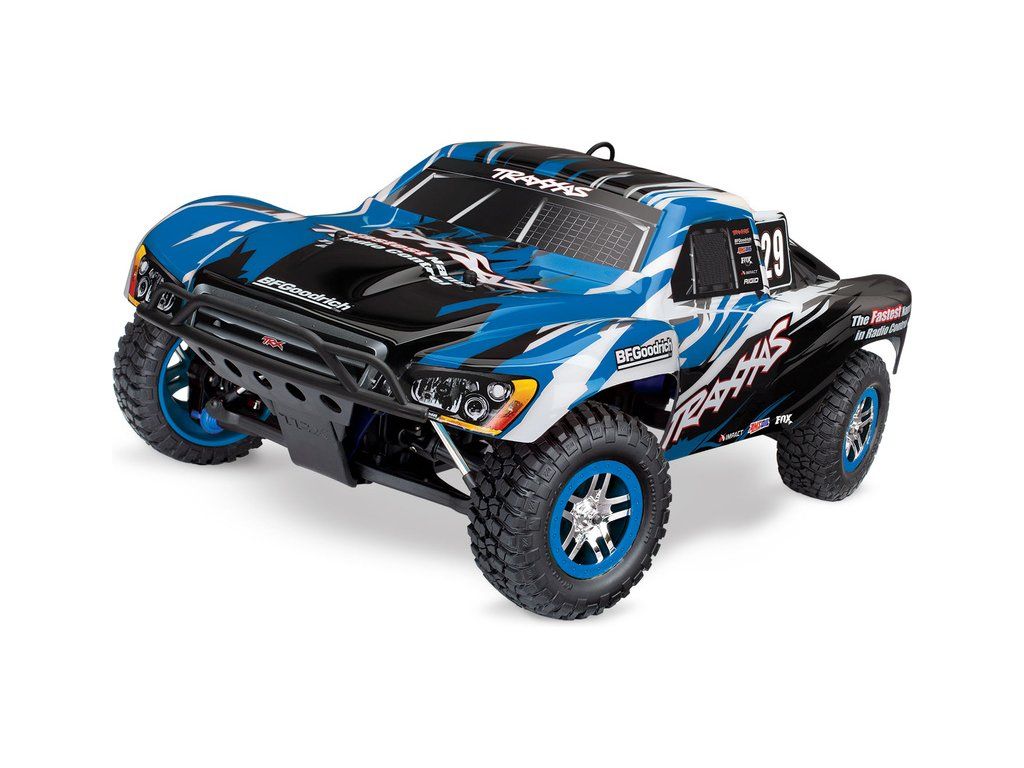 Závodní Short Course RC model auta Traxxas Slayer Pro 4x4 je špičkový nástroj k vítězství. Výkonný závodní motor TRX 3.3, laděný výfuk, tuhý podvozek je ze 3 mm silného 6061-T6 modře eloxovaného hliníku. Nově s RC soupravou Traxxas TQi a stabilizací Traxxas TSM.