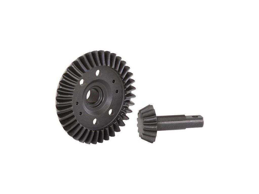 Kalené oběžné a hnací ozubené kolo pro přední diferenciály RC modelů Traxxas se spirálovým tvarem zubů. Oproti ozubeným kolům TRA5379X jsou tato ozubená kola vyrobena z pevnější oceli, ozubení je vytvořeno na CNC strojích.
