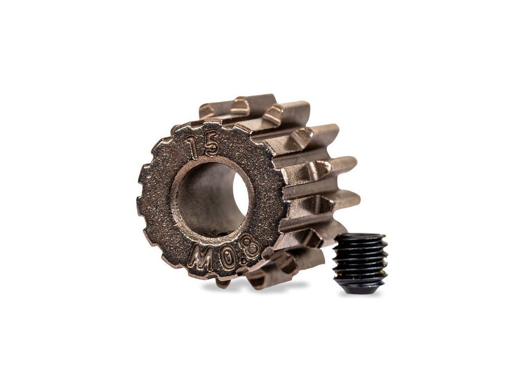 Traxxas pastorek na hřídel 5 mm s 15 zuby a modulem ozubení 32DP pro RC modely aut. Vyrobeno z sintrované oceli. Součástí balení je stavěcí šroub.