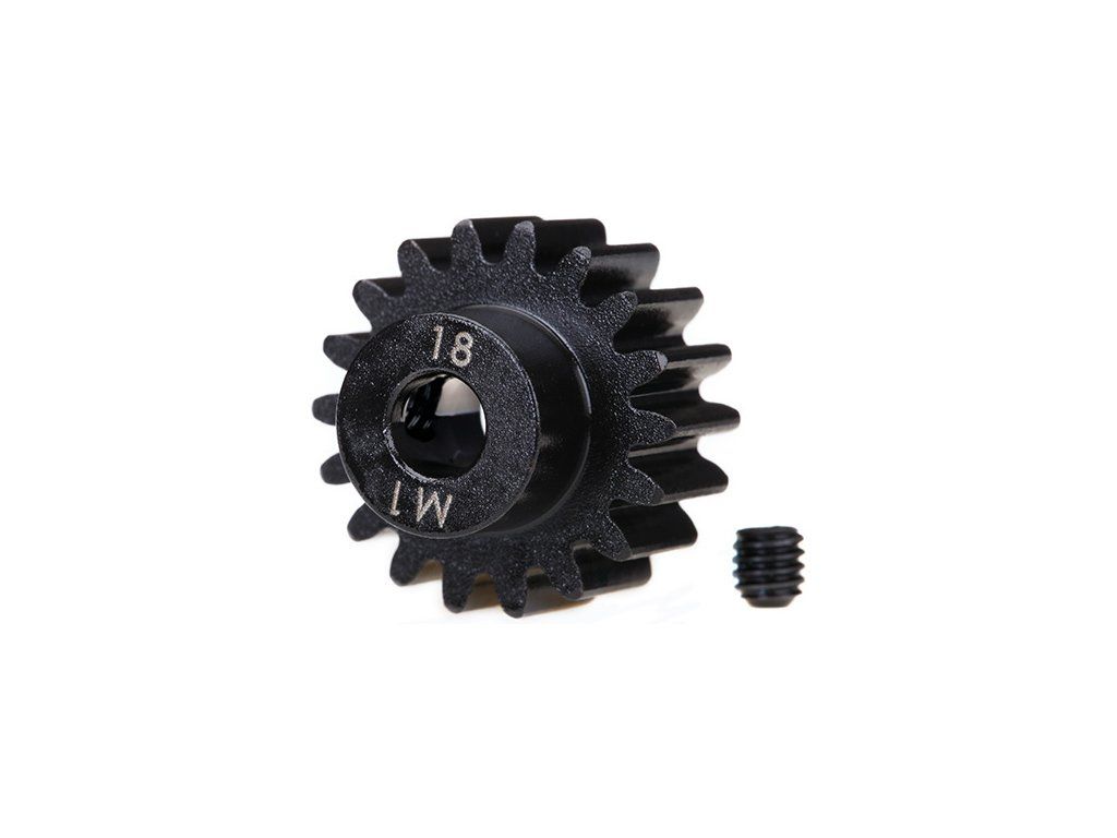 Traxxas pastorek na hřídel 5 mm s 18 zuby a modulem ozubení 1 mm pro RC modely aut. Vyrobeno z kalené nástrojové oceli. Součástí balení je červík.