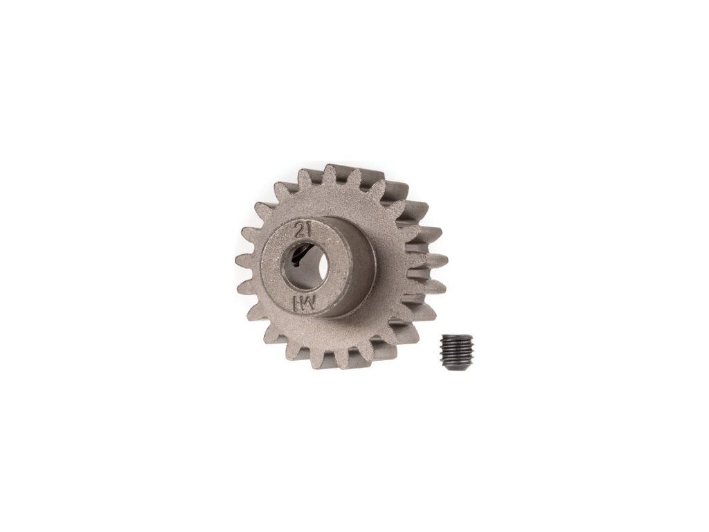 Traxxas pastorek na hřídel 5 mm s 21 zuby a modulem ozubení 1 mm pro RC modely aut. Vyrobeno z sintrované oceli. Součástí balení je stavěcí šroub.