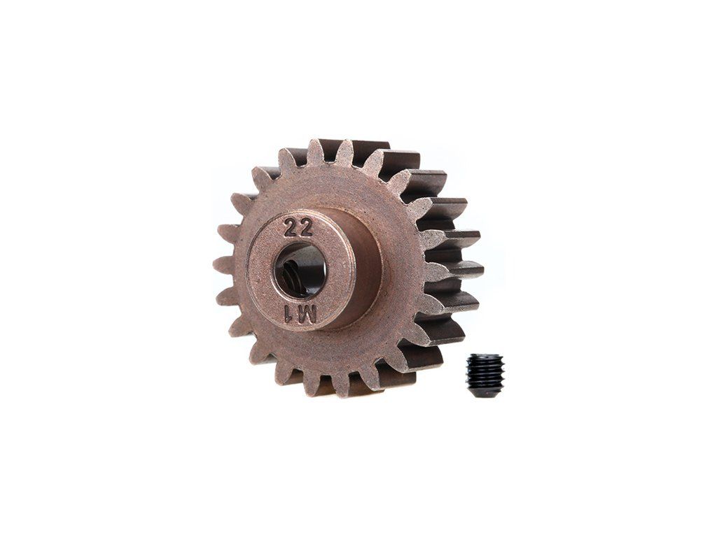 Traxxas pastorek na hřídel 5 mm s 22 zuby a modulem ozubení 1 mm pro RC modely aut. Vyrobeno z sintrované oceli. Součástí balení je červík.