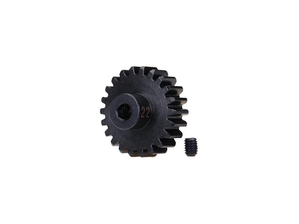 Traxxas pastorek na hřídel 3.17 mm (1/8") s 22 zuby a modulem ozubení 32DP ( 0,8 mm ) pro RC modely aut. Vyrobeno z kalené nástrojové oceli. Součástí balení je červík.