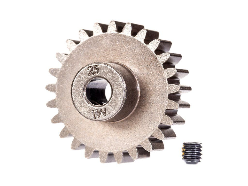 Traxxas pastorek na hřídel 5 mm s 25 zuby a modulem ozubení 1 mm pro RC modely aut. Vyrobeno z sintrované oceli. Součástí balení je stavěcí šroub.