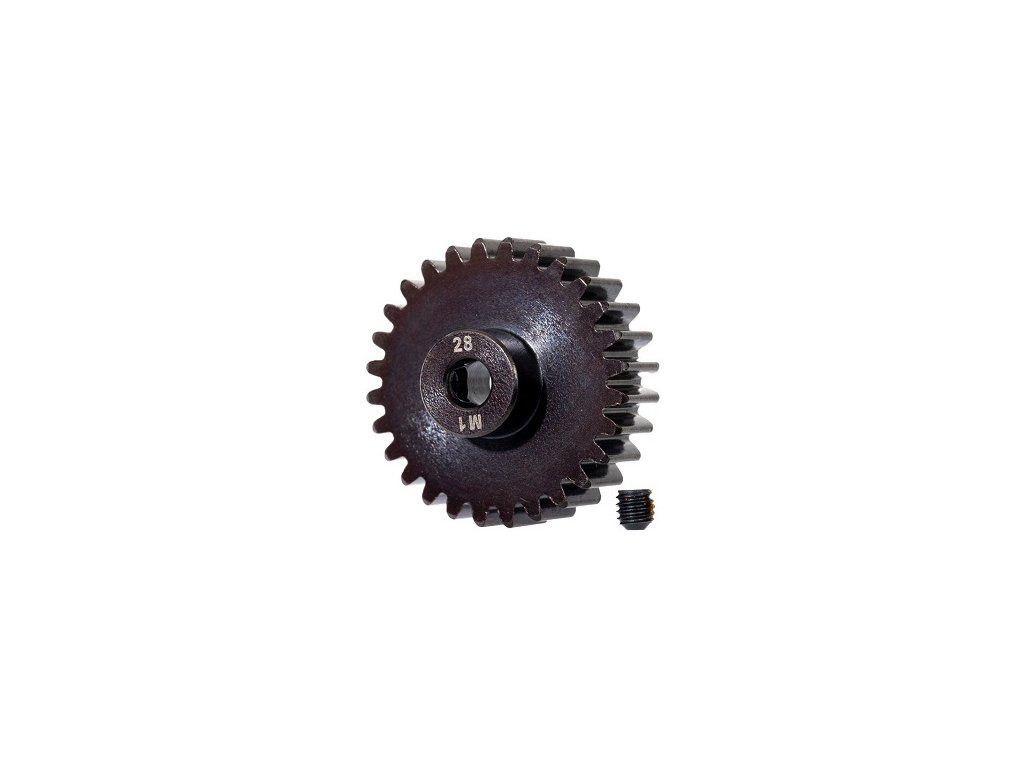 Traxxas pastorek na hřídel 5 mm s 28 zuby a modulem ozubení 1 mm pro RC modely aut. Vyrobeno z kalené oceli. Součástí balení je stavěcí šroub.