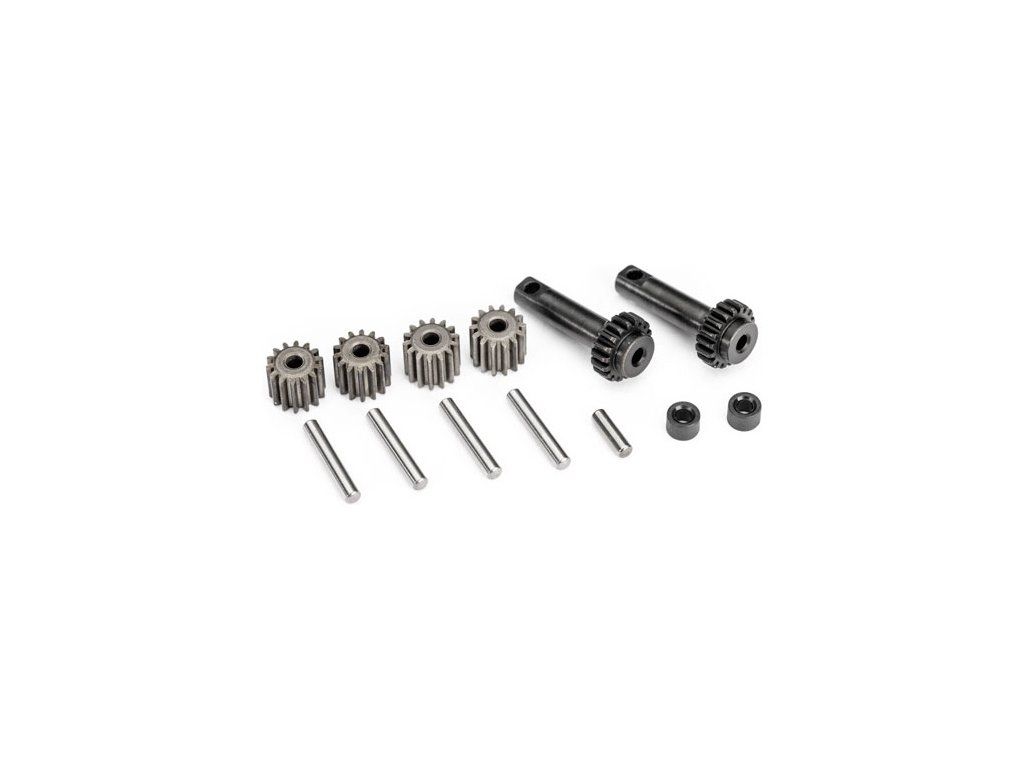 Náhradní díl pro RC modely aut Traxxas 1:12 Mini: planetová kola diferenciálu. Obsahuje výstupní převody (2), výstupní hřídel převodů (1), planetové převody (4), hřídele planetový převodů (4), vymezovače (2).