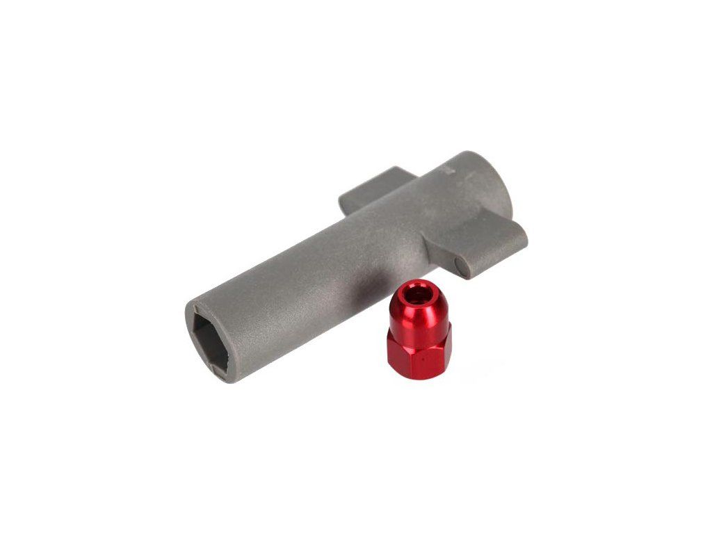Matice červená hliníková Traxxas slouží pro utažení trubičky antény v kleštině. K utažení matice je přiložen nástrčný klíč.