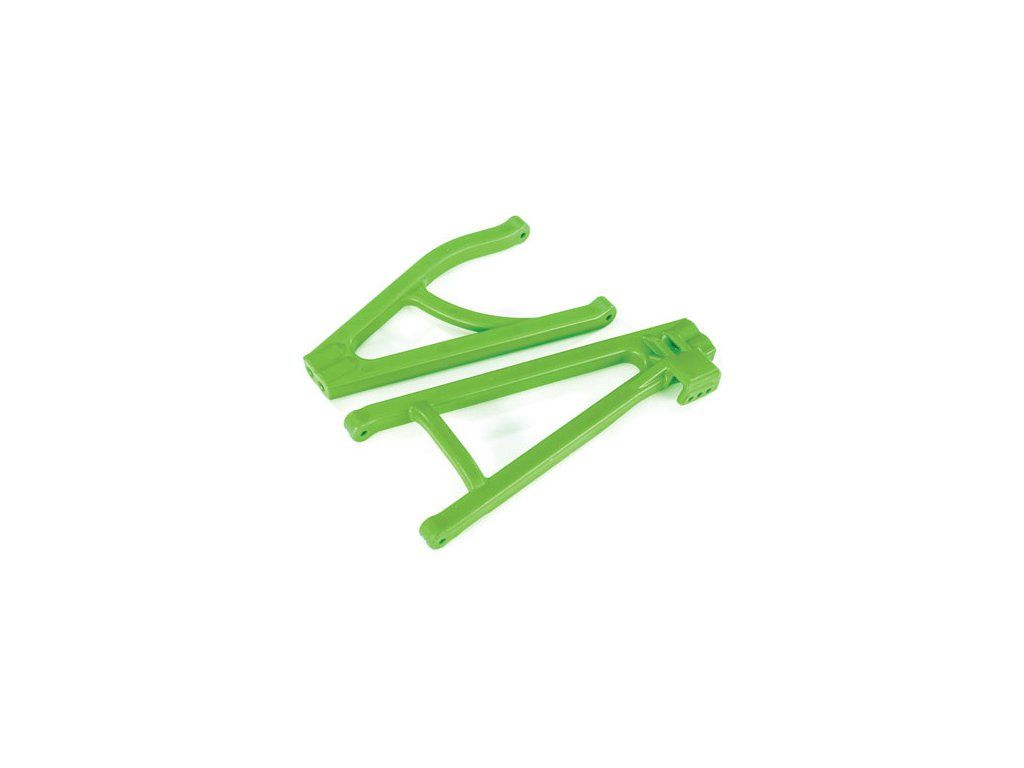 Náhradní díl pro RC modely aut Traxxas E-Revo 1:8 VXL: ramena závěsu kol zadní levé zelené - tuningový díl. Otvory pro nastavitelný rozvor.