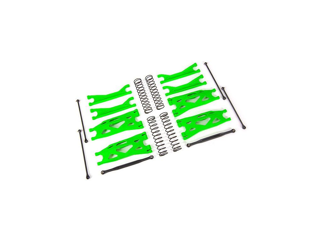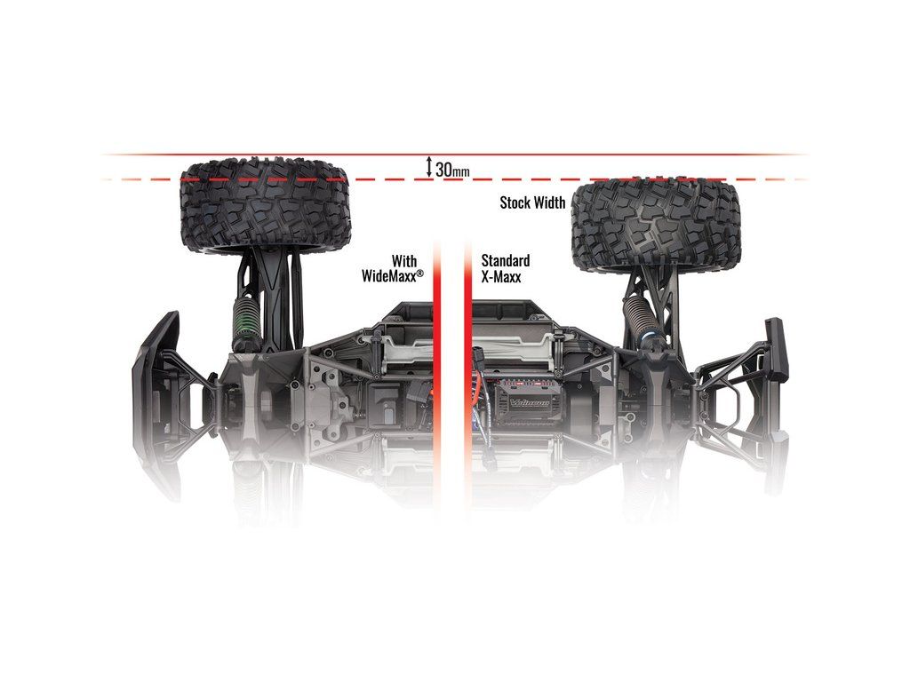 Traxxas tuningová sada WideMaxx - zelená, pro RC model auta X-Maxx, slouží k rozšíření rozchodu kol o 60 mm, oproti originální šířce. X-Maxx tak bude více stabilní a umožní ještě agresivnější jízdu. Nový materiál ramen je odolnější a to i v chladném počasí.