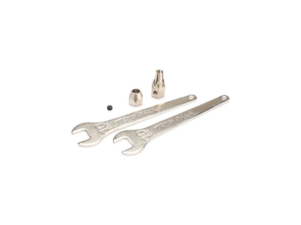 Náhradní díl pro RC modely lodí Traxxas: spojka motorů, klíče kleštiny pro montáž a demontáž lodní hřídele. Včetně stavěcího šroubu (červíku) M4x3.