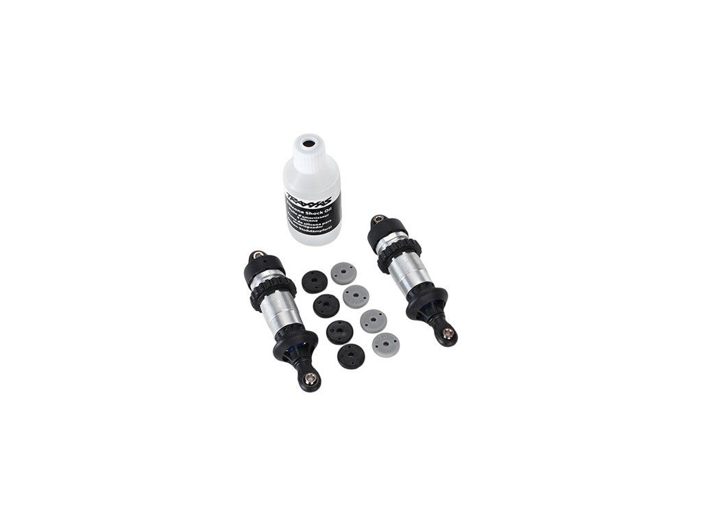Traxxas tlumič GTR hliníkový lesklý (2ks pření, 2ks zadní) se silikonovým olejem. Konstrukce GTR má hliníkové tělo se závitem a kroužkem pro přesné nastavení předpětí. Chromované hřídele mají vysokou životnost a hladký chod. Uvnitř tlumiče jsou tlumící pryžové tělesa, aby se zajistilo dokonalé tlumení.