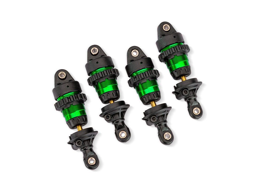 Traxxas tlumič Mini GTR hliníkový zelený (4) (4) včetně pružiny (4). Vyrobeno z odolného eloxovaného hliníku. Matice pro snadné nastavení předpětí pružin. Tělo potaženo PTFE (teflonem) pro dlouhotrvající a ultra plynulý tlumící výkon. Pístnice z kalené oceli má povrch povlakovaný nitridem titanu pro tvrdost, otěruvzdornost a snížení tření. Těsnící X-kroužky.