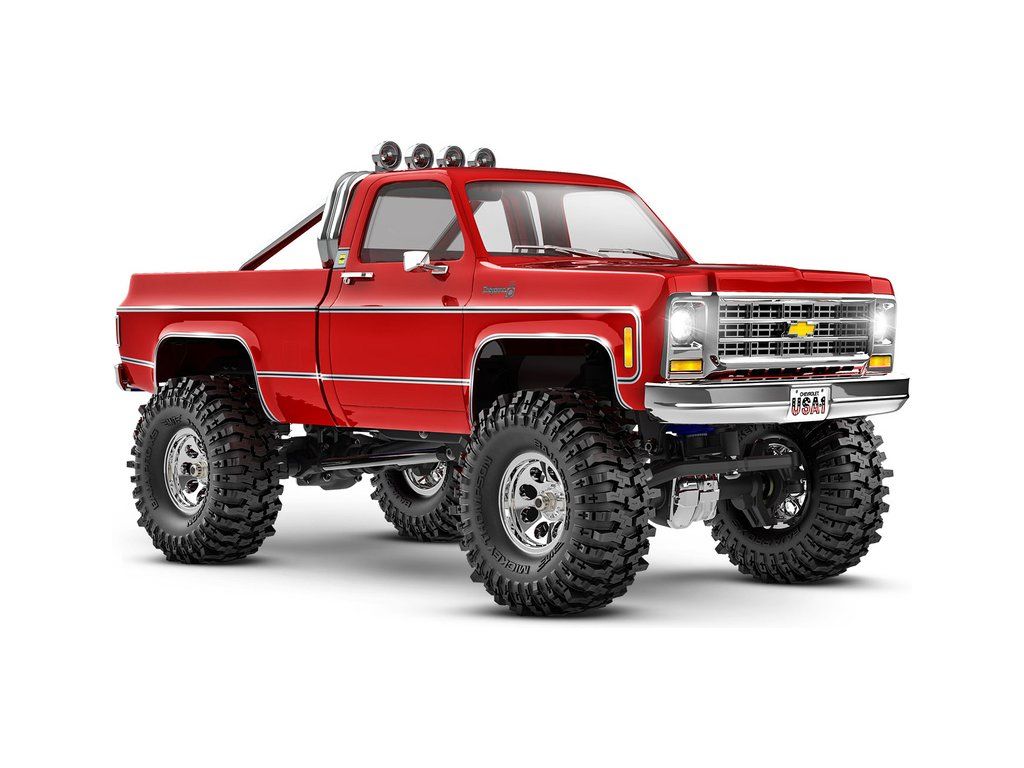RC model auta Traxxas TRX-4M Chevrolet K10 1979 v edici High Trail s vyšší světlou výškou, většími koly, úžasnou všestranností a schopnostmi. Kovový podvozek, 4-bodové zavěšení, olejové tlumiče, úhel zatáčení 45°, bez-sponková karoserie, přední LED světlomety. Baterie 2S LiPo a USB nabíječ.
