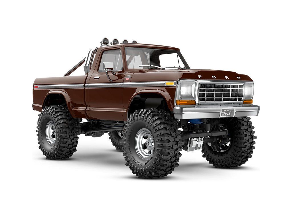 RC model auta Traxxas TRX-4M Ford F-150 1979 v edici High Trail s vyšší světlou výškou, většími koly, úžasnou všestranností a schopnostmi. Kovový podvozek, 4-bodové zavěšení, olejové tlumiče, úhel zatáčení 45°, bez-sponková karoserie, přední LED světlomety. Baterie 2S LiPo a USB nabíječ.