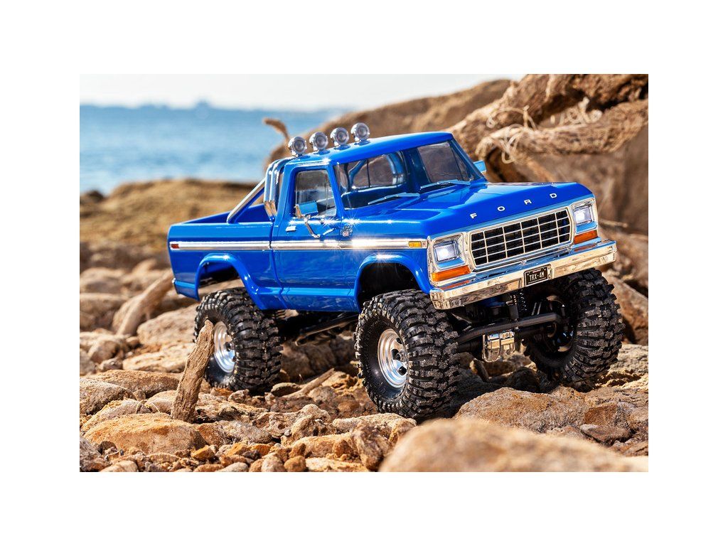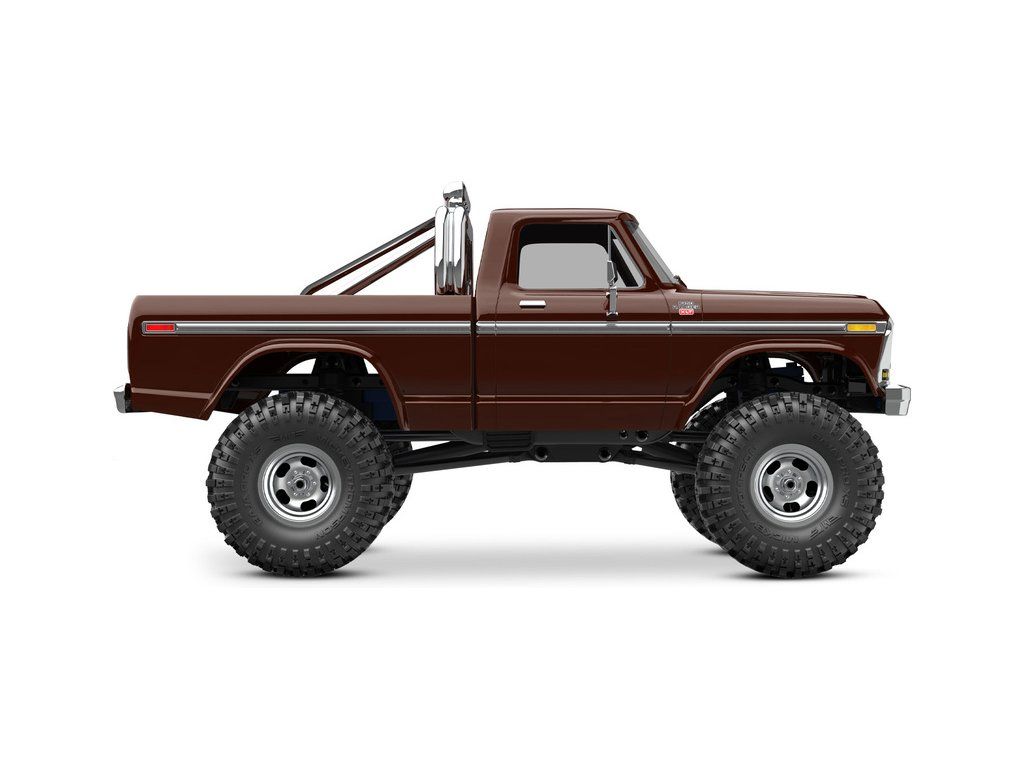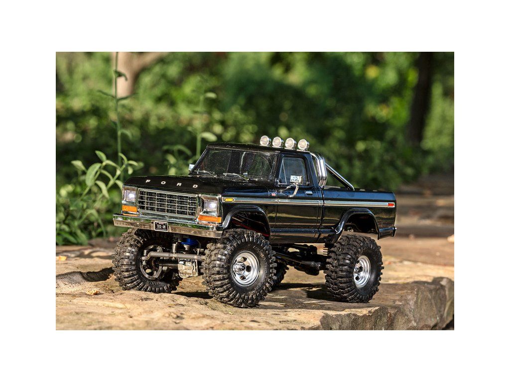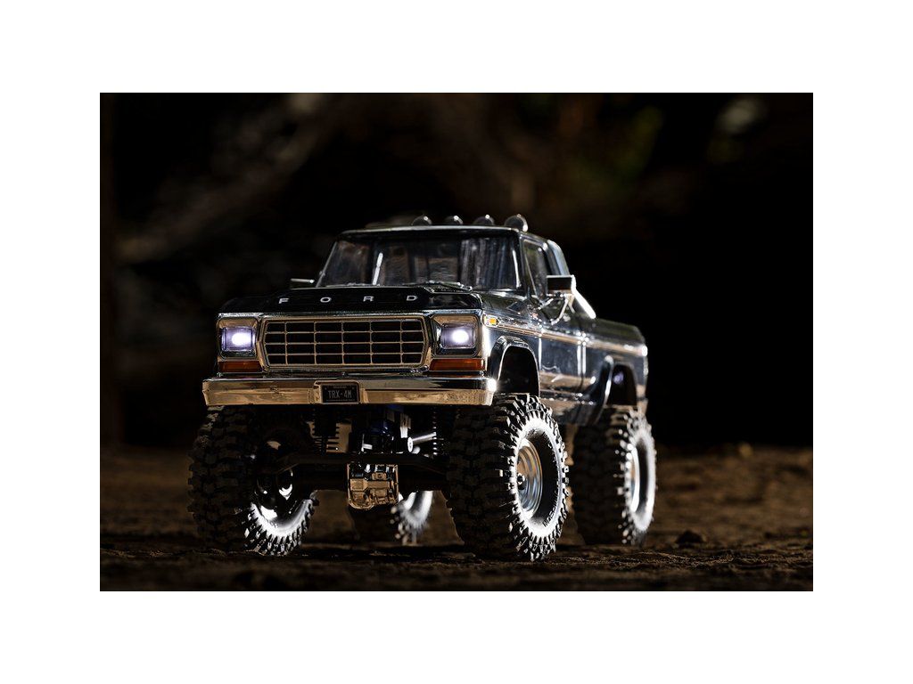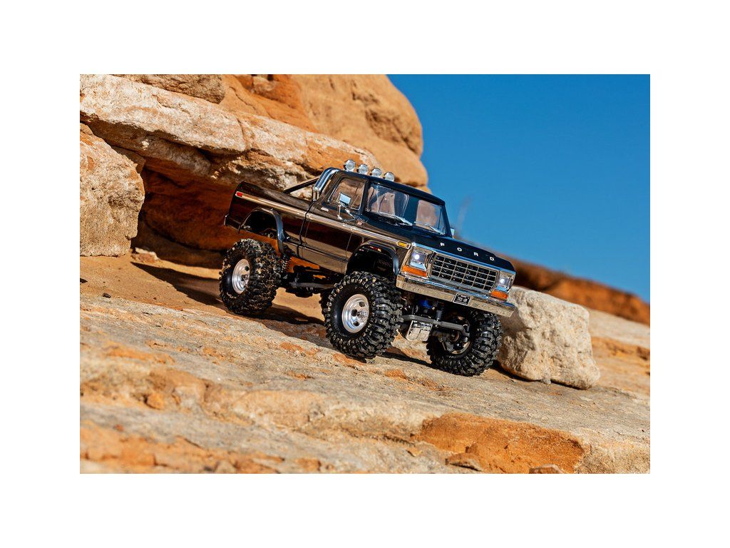 RC model auta Traxxas TRX-4M Ford F-150 1979 v edici High Trail s vyšší světlou výškou, většími koly, úžasnou všestranností a schopnostmi. Kovový podvozek, 4-bodové zavěšení, olejové tlumiče, úhel zatáčení 45°, bez-sponková karoserie, přední LED světlomety. Baterie 2S LiPo a USB nabíječ.