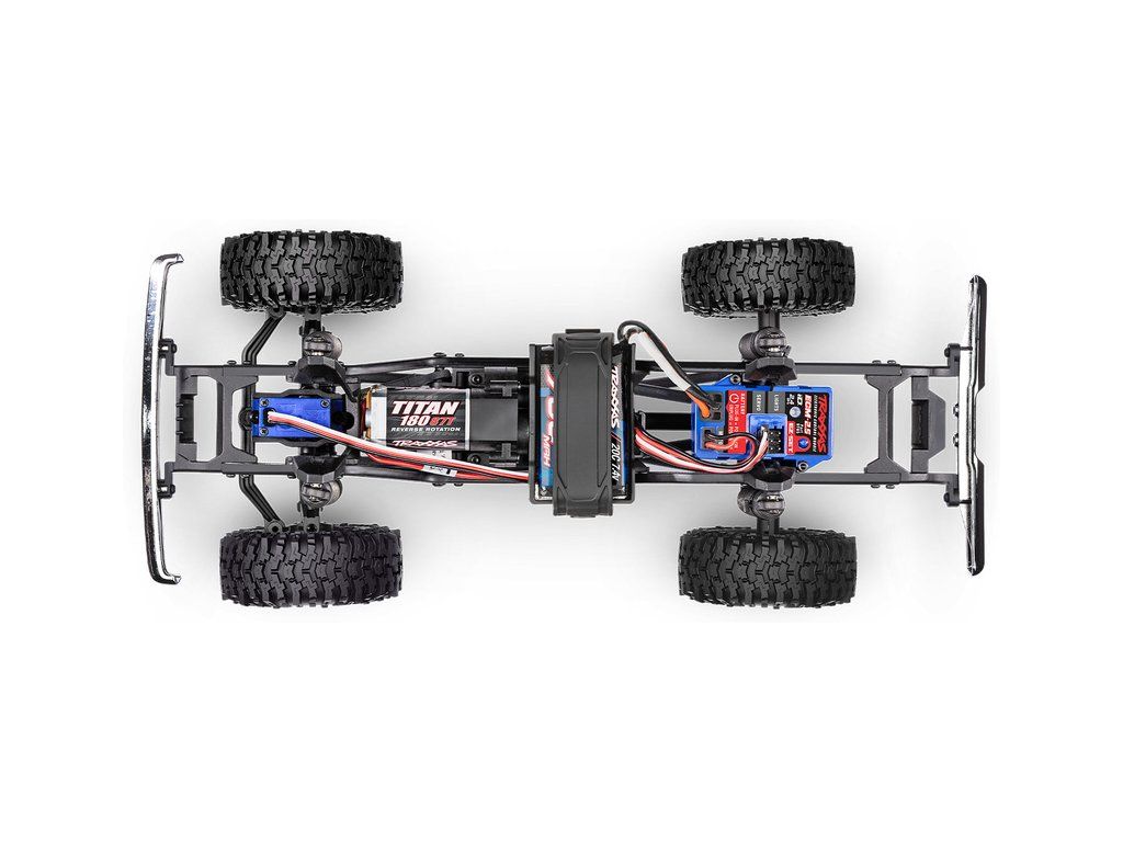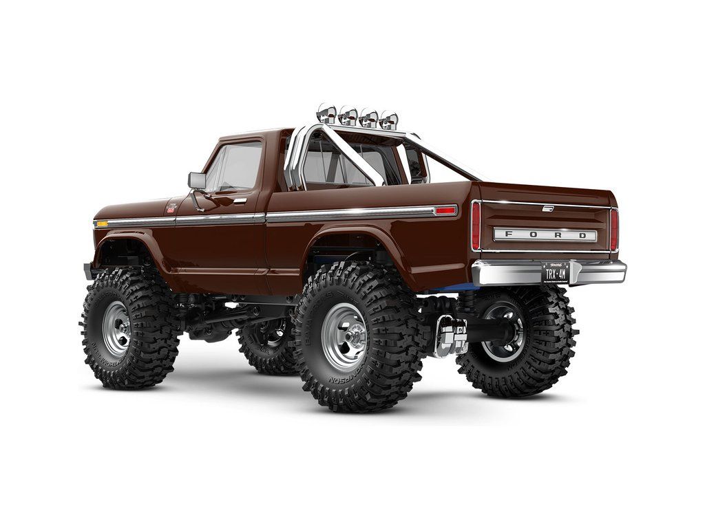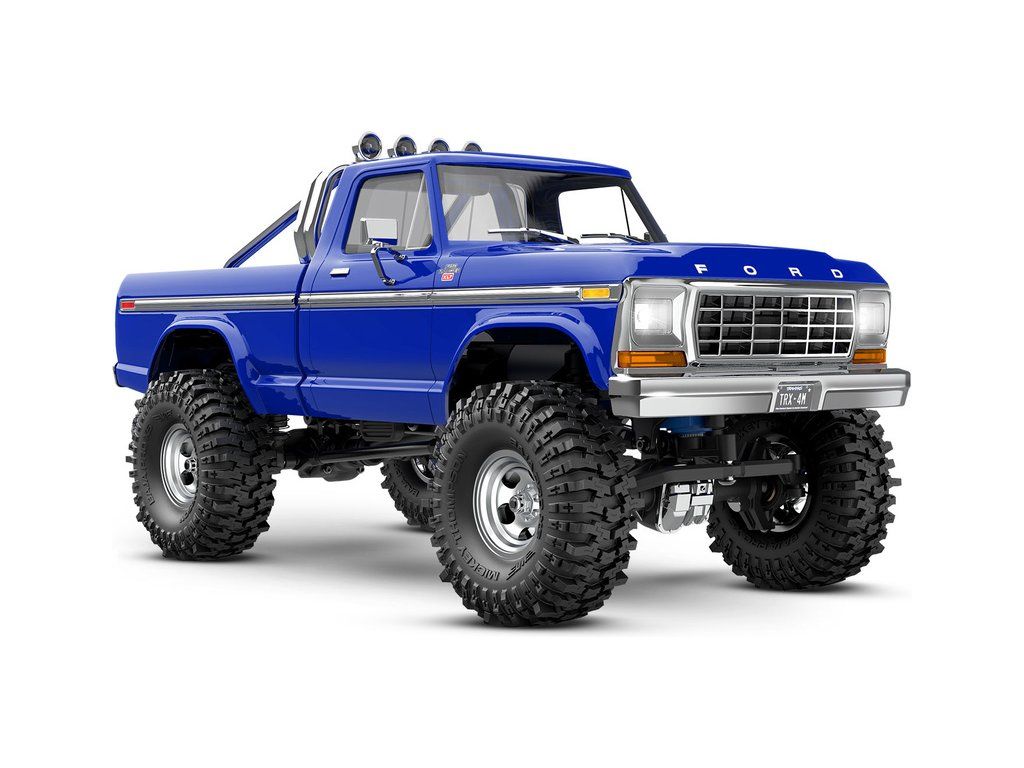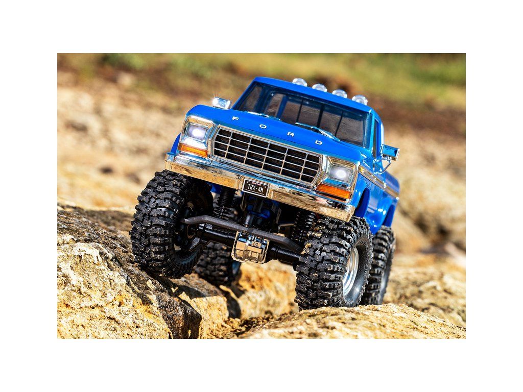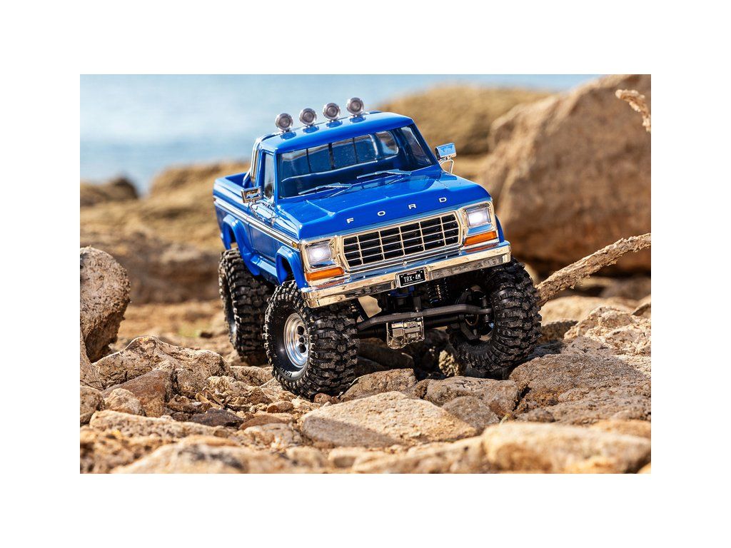 RC model auta Traxxas TRX-4M Ford F-150 1979 v edici High Trail s vyšší světlou výškou, většími koly, úžasnou všestranností a schopnostmi. Kovový podvozek, 4-bodové zavěšení, olejové tlumiče, úhel zatáčení 45°, bez-sponková karoserie, přední LED světlomety. Baterie 2S LiPo a USB nabíječ.