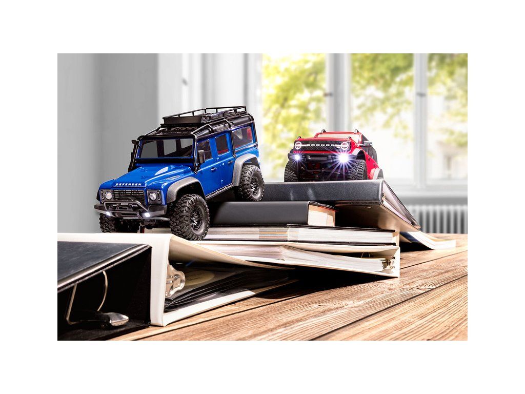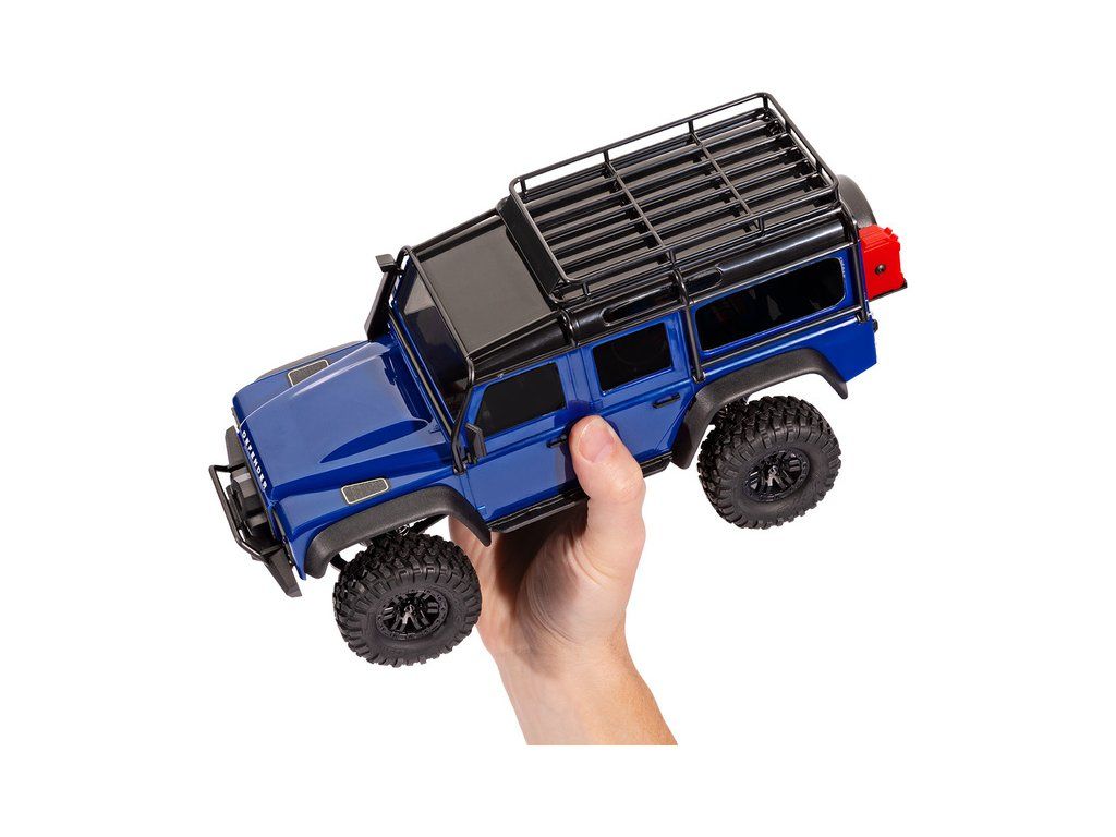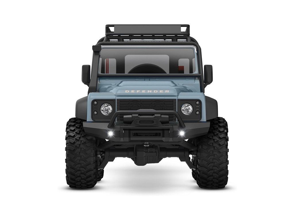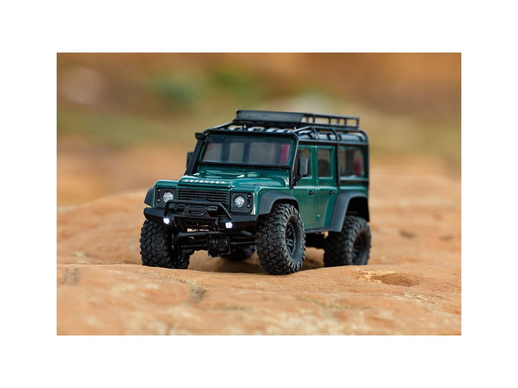 RC model auta Traxxas TRX-4M Land Rover Defender v měřítku 1:18 s úžasnou všestranností a schopnostmi. Kovový rám podvozku se 4-bodovým zavěšením, olejové tlumiče, úhel zatáčení 45°, licencovaná bez-sponková karoserie, LED osvětlení v nárazníku. Baterie 2S LiPo a USB nabíječ.