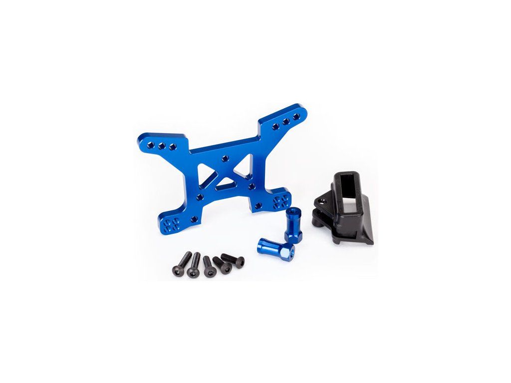 Náhradní díl pro RC model auta Traxxas Rustler 4WD: věž předních tlumičů modře eloxovaná, z velmi pevného hliníku 7075-T6. Včetně držáku karoserie.