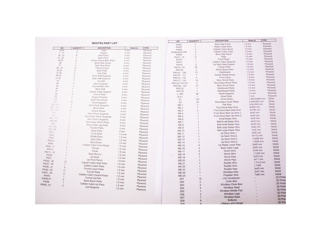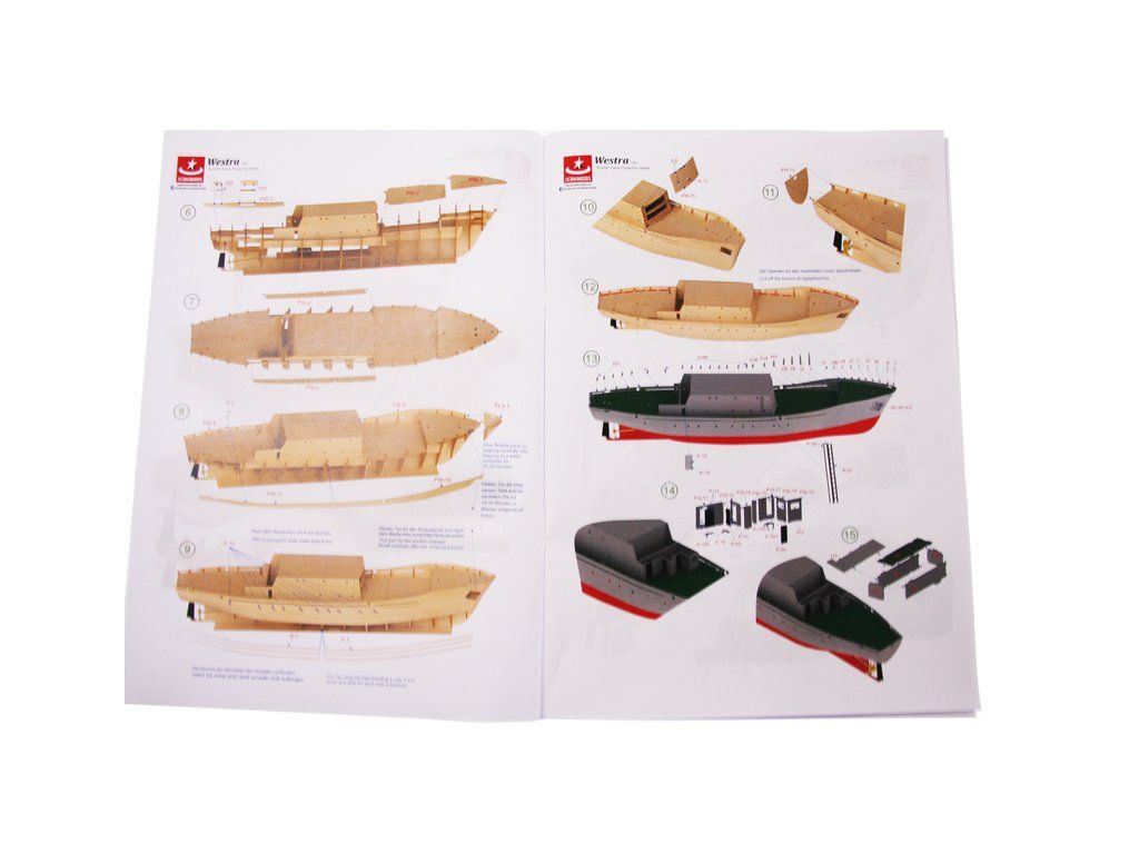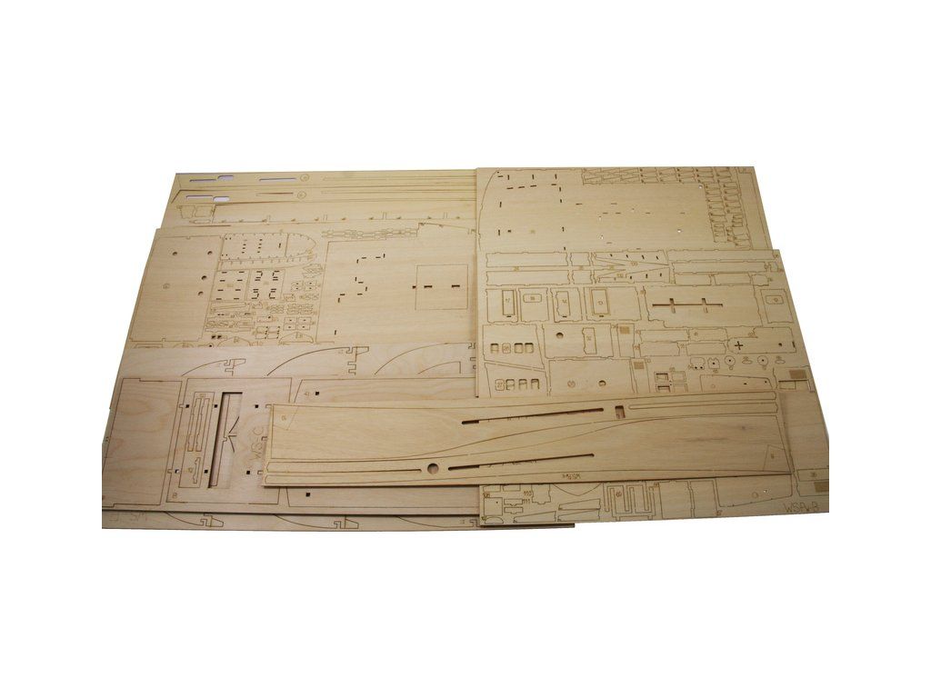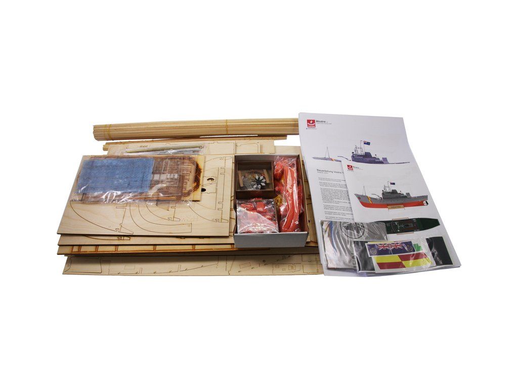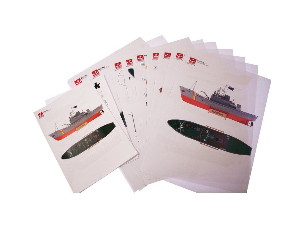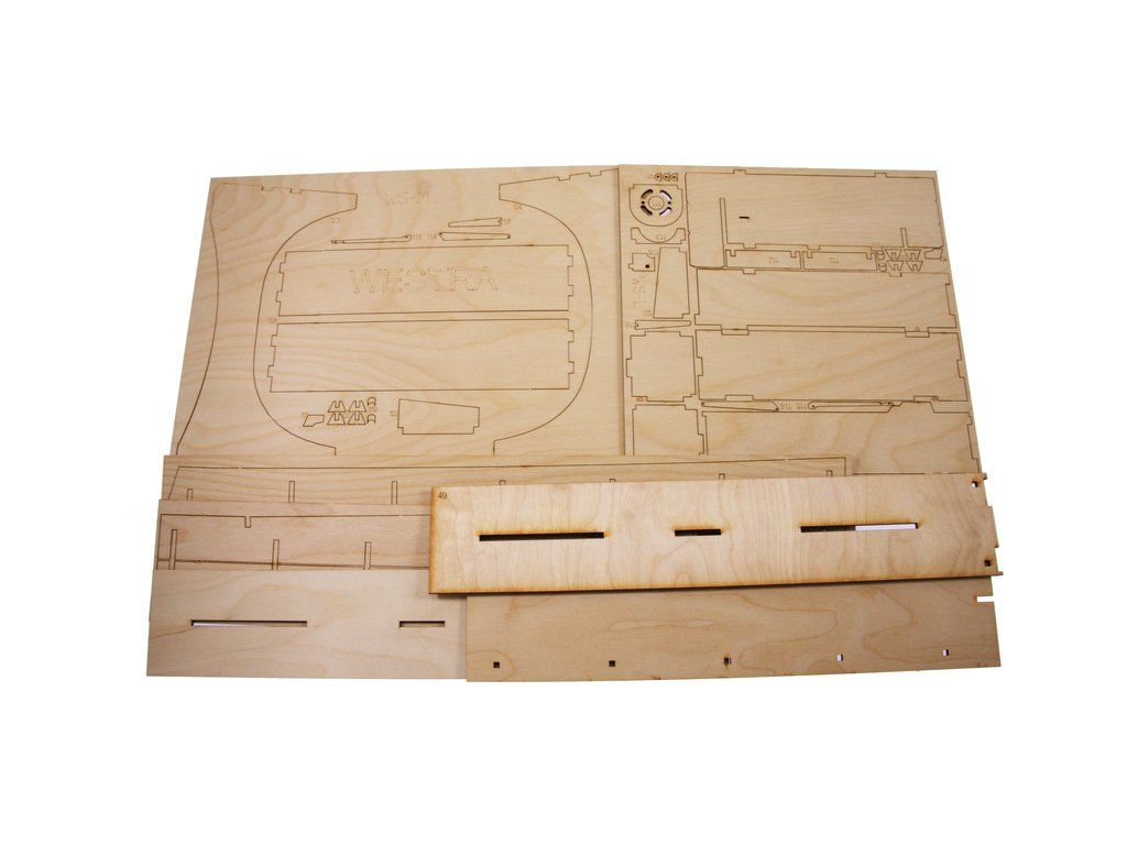 Balení obsahuje díly pro stavbu lodi FPV Westra: díly překližky, lišty, laserem řezané dřevěné díly, maketové díly 3D tisku. Obrázkový manuál EN.