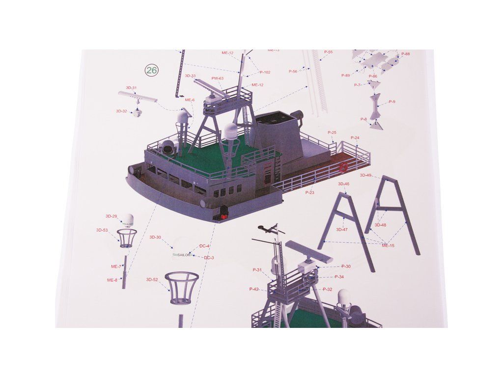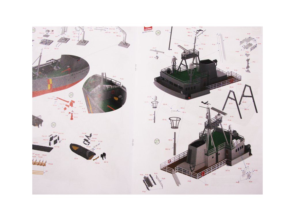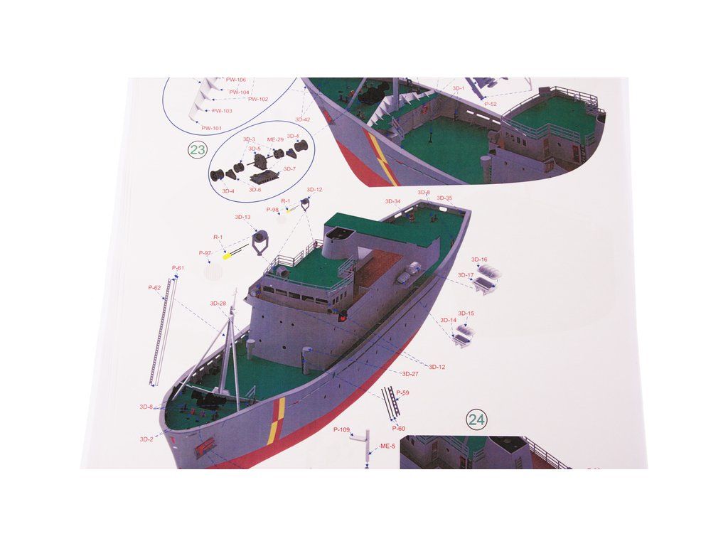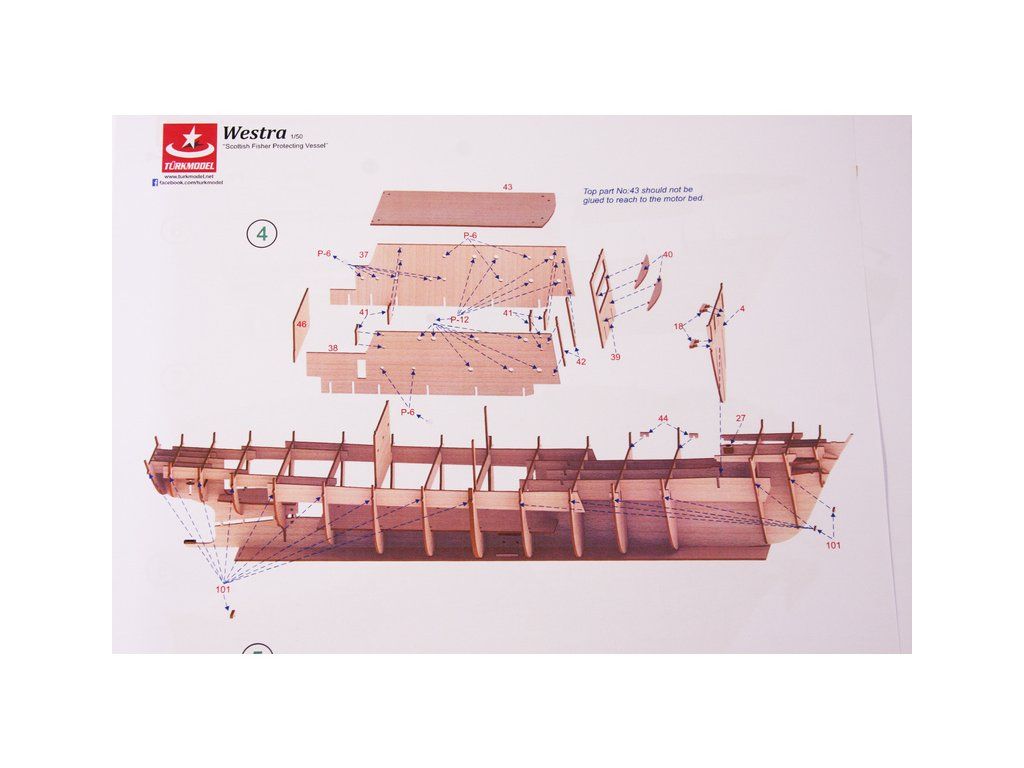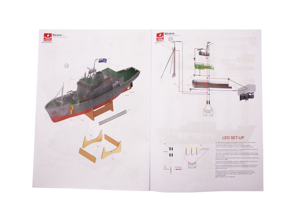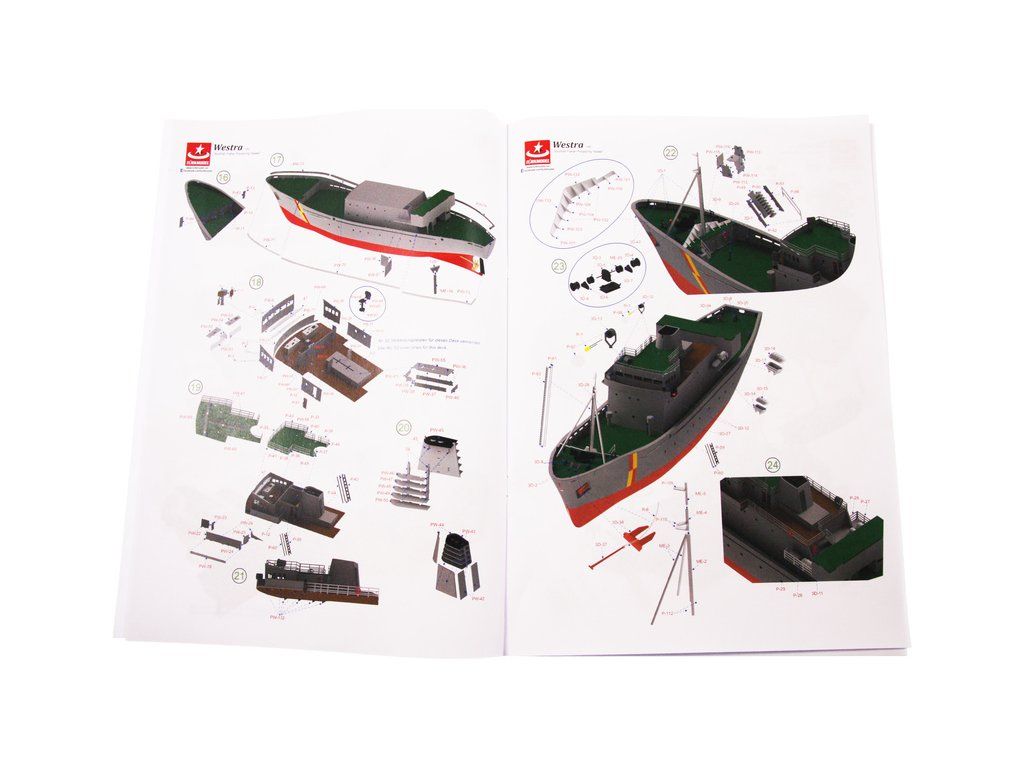 Balení obsahuje díly pro stavbu lodi FPV Westra: díly překližky, lišty, laserem řezané dřevěné díly, maketové díly 3D tisku. Obrázkový manuál EN.